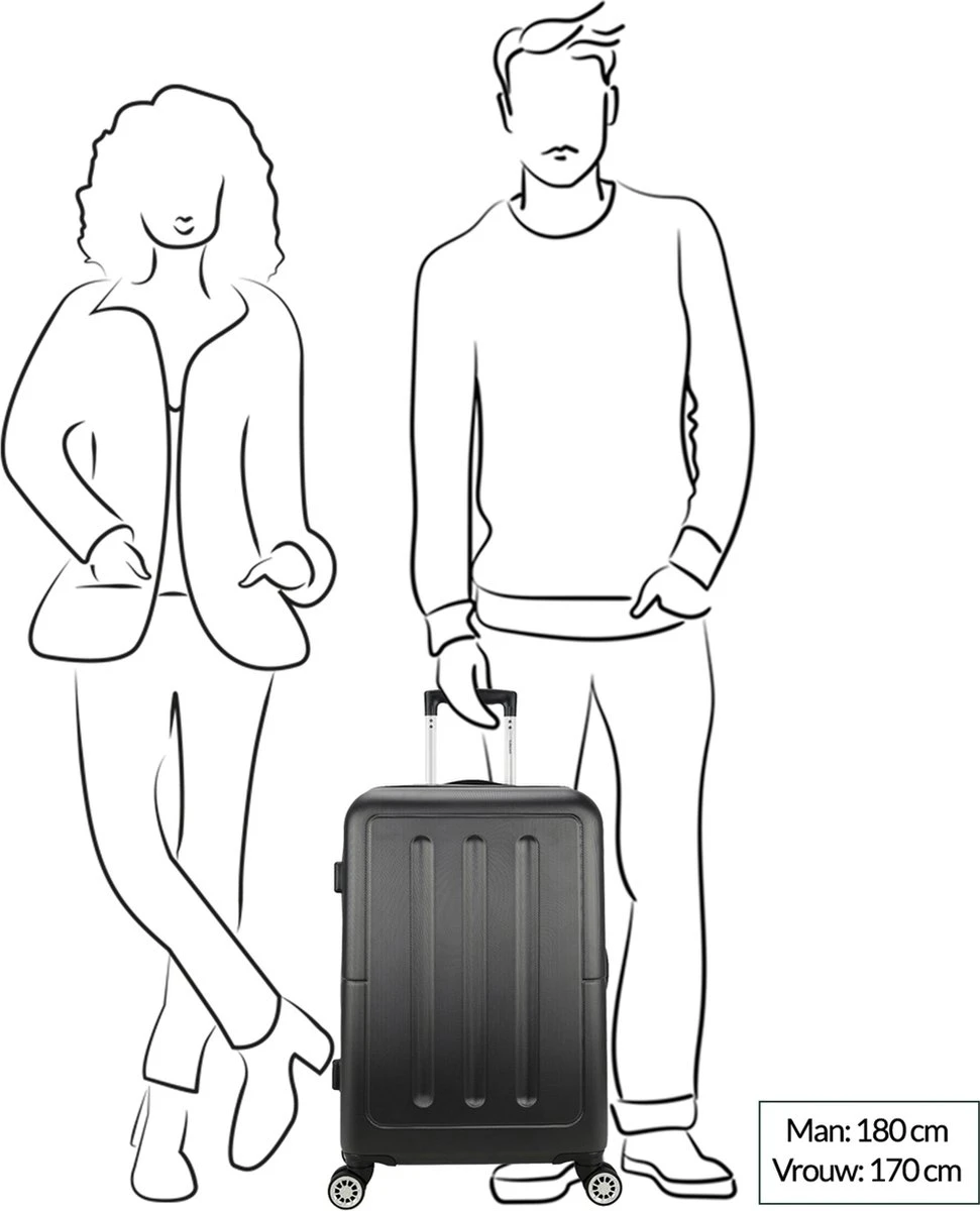 Middelgrote hardschalen ABS koffer. Koffer is voorzien van een rits rondom die op slot te zetten is middels een vast TSA slot op de zijkant van de koffer. Binnenin gevoerd en voorzien van meerdere insteek- en ritsvakken voor het overzichtelijk opbergen van uw bagage. Het 4-wiel systeem en de verstelbare trekstang bieden extra reiscomfort.