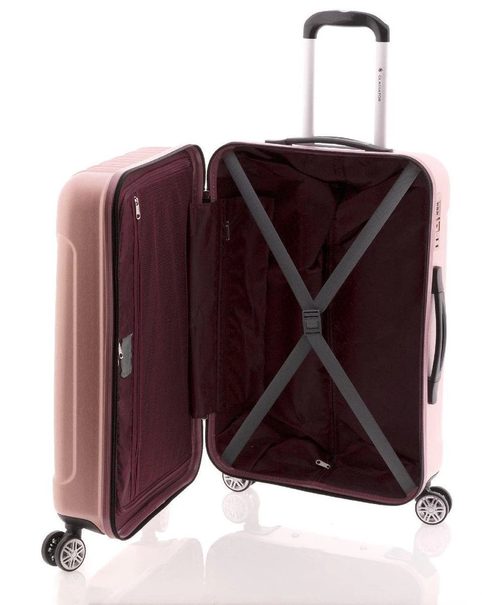 Middelgrote luxe hardschalen, polycarbonaat koffer met dubbele velgwielen en TSA slot. Koffer is voorzien van een ritssluiting rondom. Binnenin gevoerd met bordeaux rode stof en voorzien van tussenschot met ritssluiting, ritsvakje en spanbanden. Koffer is op slot te zetten middels een vast TSA cijferslot op de zijkant van de koffer. Handvat op boven- en zijkant en voorzien van comfortabel 4-wiel systeem. Deze koffer heeft een bijzondere, moderne uitstraling doordat de koffer niet glanzend is maar juist mat/dof.